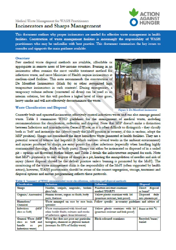 This document outlines why proper incinerators are needed for effective waste management in health facilities. Construction of waste management facilities is increasingly the responsibility of WASH practitioners who may be unfamiliar with best practice. This document summarises the key issues to consider and signposts the main guidance available.