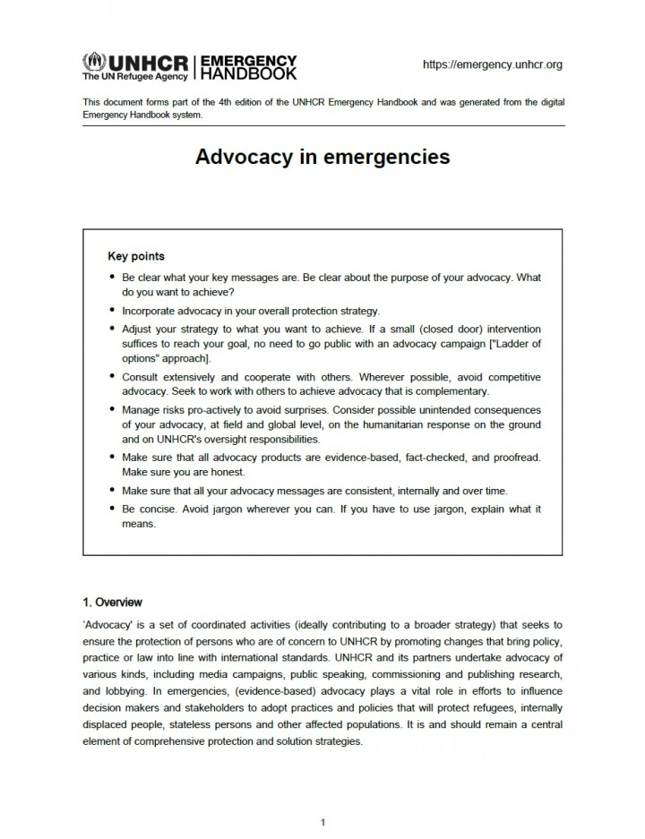 ‘Advocacy' is a set of coordinated activities (ideally contributing to a broader strategy) that seeks to ensure the protection of persons who are of concern to UNHCR by promoting changes that bring policy, practice or law into line with international standards. UNHCR and its partners undertake advocacy of various kinds, including media campaigns, public speaking, commissioning and publishing research, and lobbying. In emergencies, (evidence-based) advocacy […]