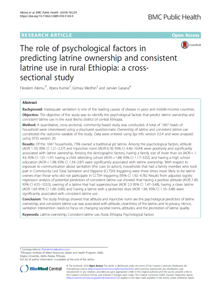 Inadequate sanitation is one of the leading causes of disease in poor and middle-income countries. The objective of the study was to identify the psychological factors that predict latrine ownership and consistent latrine use in the rural Becho district of central Ethiopia.